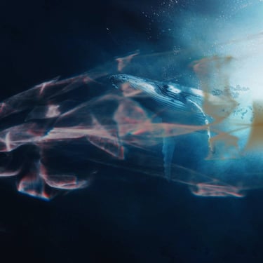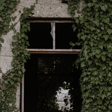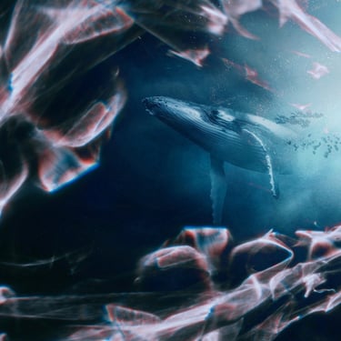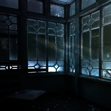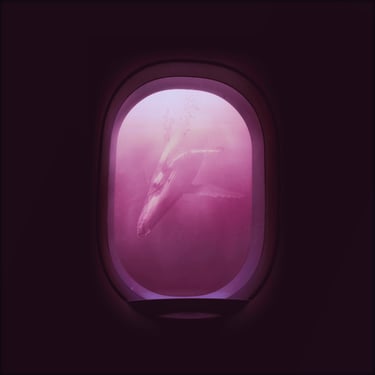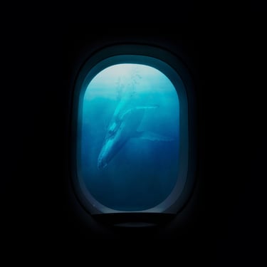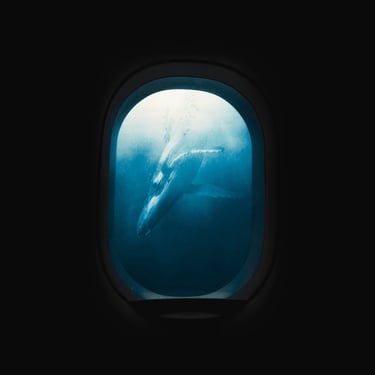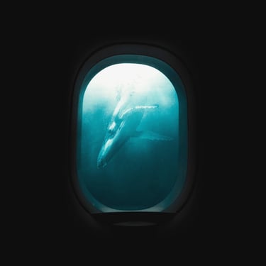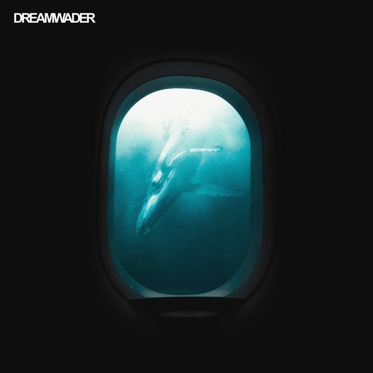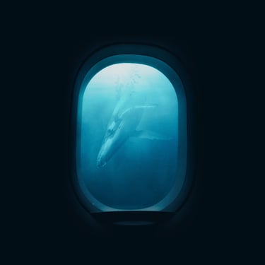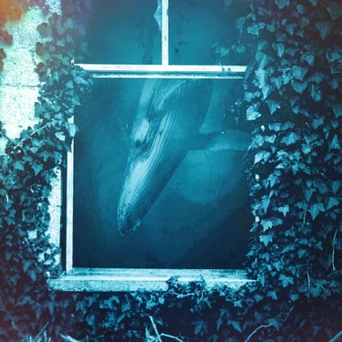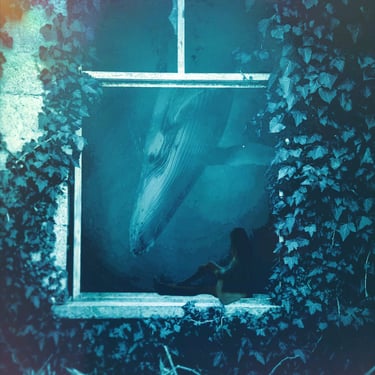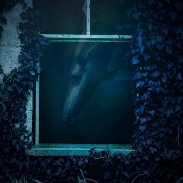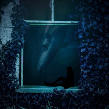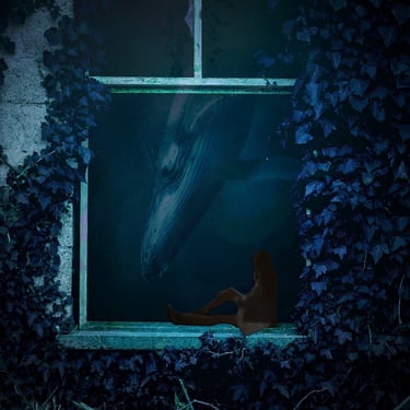 Initially, I explored the idea of an overgrown, ruined building framing the shot, so I found an image of a broken window with overgrown ivy. I overlaid the whale with it, blocking out a patch of light that was intruding through the window, and then put it all underwater with a blue tint. At several points, the image needed brightening due to the processes involved. I then realised that something was missing and to make this image feel more like a dream, I decided to include the silhouette of the dreamer which could act as a proxy for us, the viewer. This was done by finding an image of a girl in a window, cutting her out with a free online tool, and darkening her into a silhouette, before overlaying her into the window-frame. However, while I was pleased with the result, I felt that it didn't quite fit the feel of the track.