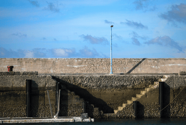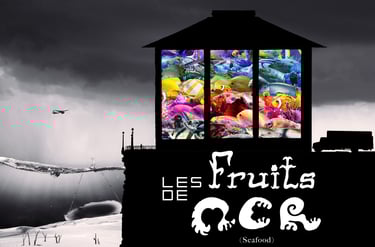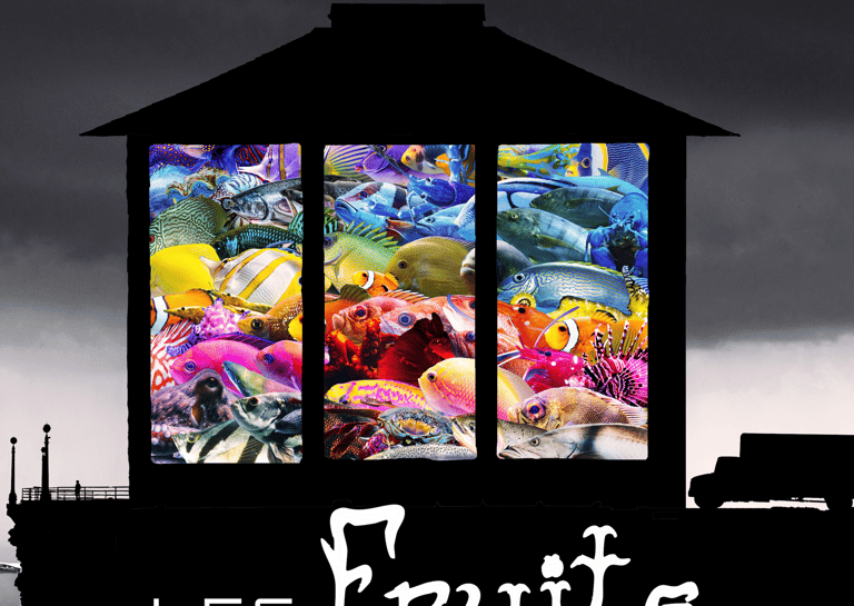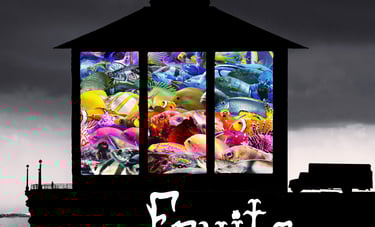 I wanted to convey themes of order, systems, illusory promise, and the sense of feeling caged. This was done by placing the fish behind the supermarket windows, which look simultaneously like prison bars or advertisements. The van and plane (below) also add to the sense of mass industry, logistical operations and globalism. I took the roof from a building in Bude, Cornwall as well as using images of a harbourside and pier to blend this section into its seaside surroundings.
