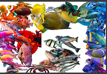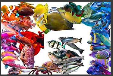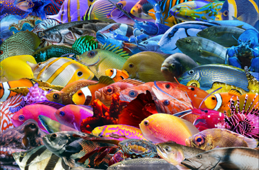I went through several copyright-free image sites to find as many colourful and clear images of fish as possible, then in a separate photoshop project, manually sorted them by colour so that I could then arrange my rainbow. This collage part was a bit like a jigsaw puzzle, fitting the different fish together by shape and size while also maintaining colour order and a sense of the whole structure.