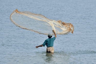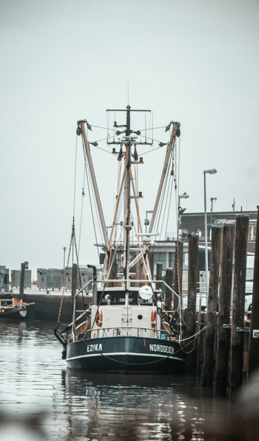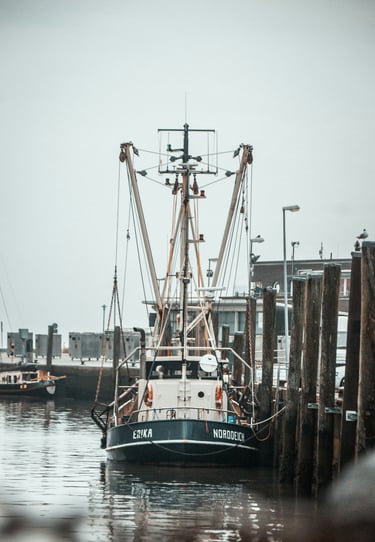 In the background, I wanted to show the threat of the open net of a trawler looming ominously for dramatic effect and also as narrative device to show how this happened. I couldn’t find any copyright-free images of trawlers fishing in the position and orientation that I imagined, or any trawler's nets from this particular angle either, so I combined the image of a docked trawler with a fisherman's throw-net, using a playground swing to make the chains. I believe that this is a more effective representation than you could physically photograph as it conveys clearly what's happening above and below the water from a perspective that would be impossible for a camera to capture.