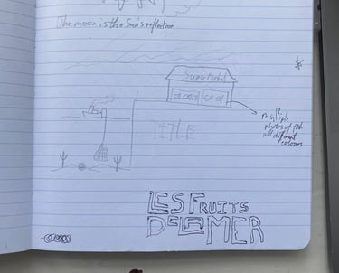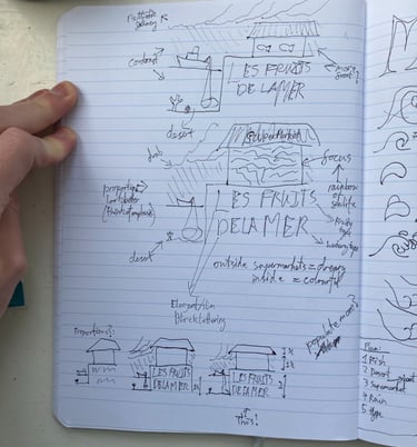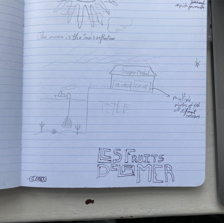I first sketched this idea in a sketching session that I did in my notebook, after trying to visualise a way that I could communicate the problem of overfishing in an emotionally impactful way. The core idea was to contrast the beautiful diversity of fish, with the barren state that we are leaving our oceans in. I really wanted to use bold symbols and visual metaphors to show what I meant.