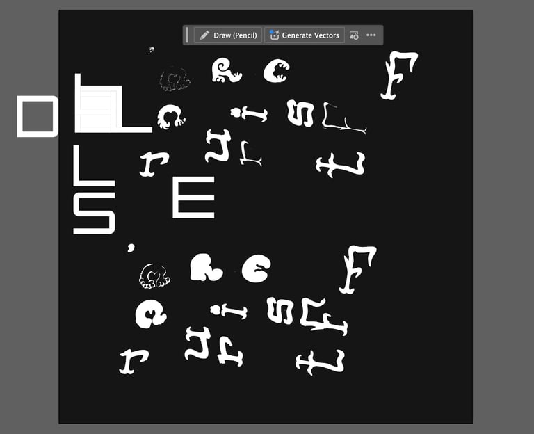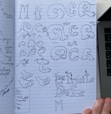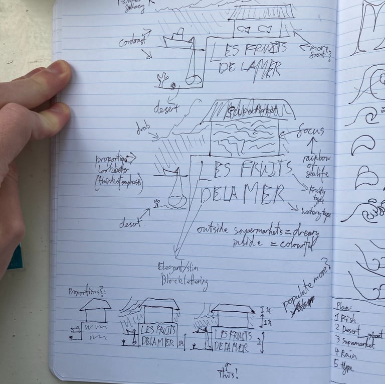 I traced the designs for "fruits" and "mer" onto tracing paper, going over them in pen. I then scanned them in and vectorised them in illustrator, before creating a template out of right angles and set distances to create my "les" font digitally. I then exported these and imported them into the main photoshop project.