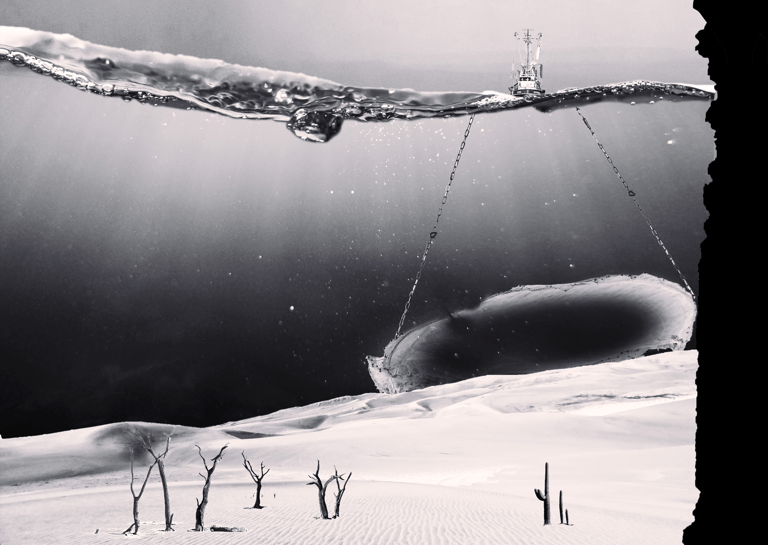 The next section of the artwork to work on was the "barren" ocean. The central way in which I showed this was by representing the ocean floor as a lifeless desert. I chose not to show any life swimming around and actually constructed it out of copyright-free images of desert environments.
