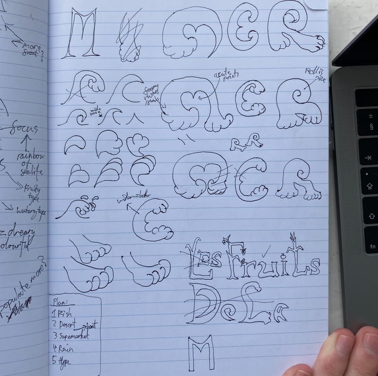 I started with "fruits" and picked the letter 'n' as my starting point (despite it not appearing) because the principles of the form of the letter 'n' appear in most of the rest of the alphabet. I then used this to form the letters that I needed on the opposite page. In the meanwhile, I had also worked out some rough proportions and ideas on another page.