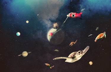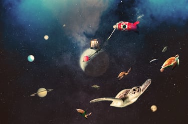 I chose an image of the starry sky for the background and populated it with planets from Nasa's images. I wanted the shape of these tertiary elements to have a flow to them creating movement and complementing the primary and secondary focuses (world and spaceship). As such, I placed them in a sort of natural spiral, flowing into the flock of flying turtles.