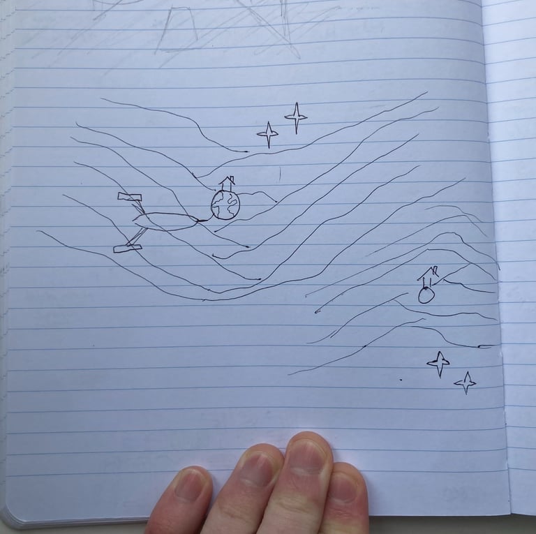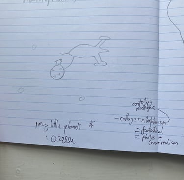 I wanted a classic-looking, Tintinesque rocket, so I actually found an image of a wooden toy rocket to which I attached life rings and moored it up like a speedboat, in order to play on the idea of a space ship. I also attached a dinghy to it which helped make this spaceship familiar, and also made it more dreamlike in theme. I liked the idea of a toy rocket because it was also quite nostalgic, bringing up memories of childhood playtime and imagination. The fact that it floats above the planet also helps give a feel of the weightlessness and lack of up or down in space.