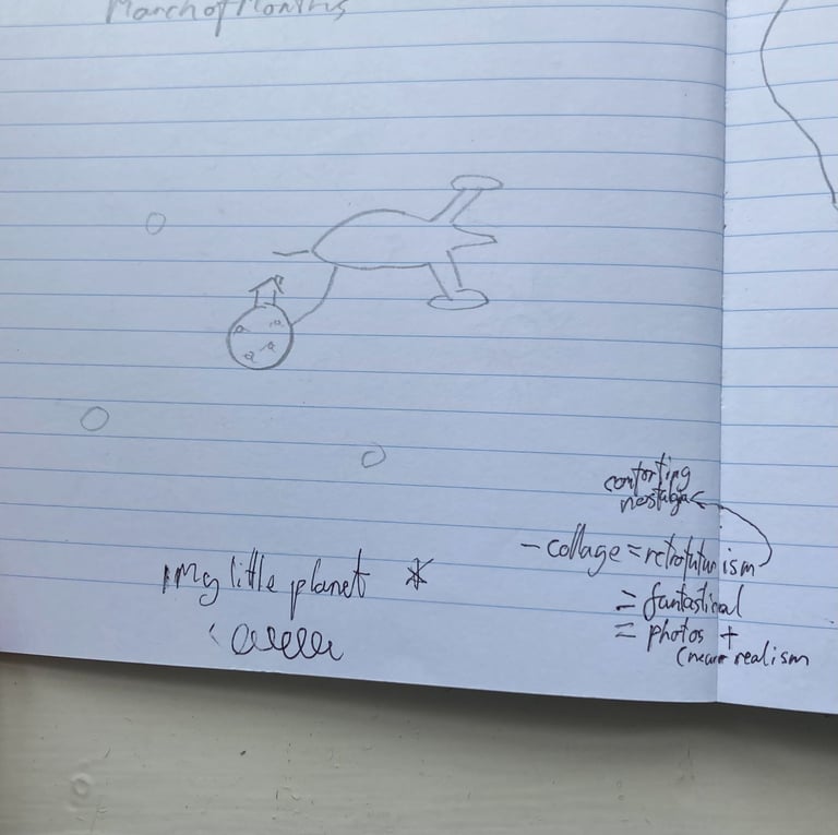 I made this piece up from copyright-free images from the web, often reinventing them in new and fun ways. The house is actually made up from parts of three different houses (two from London and one from Ireland) put together to create a home that was both familiar and fantastical. For the planet itself I used a NASA picture of the moon.