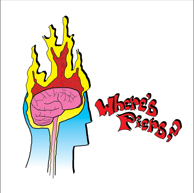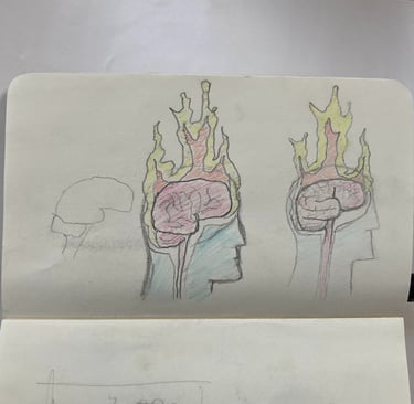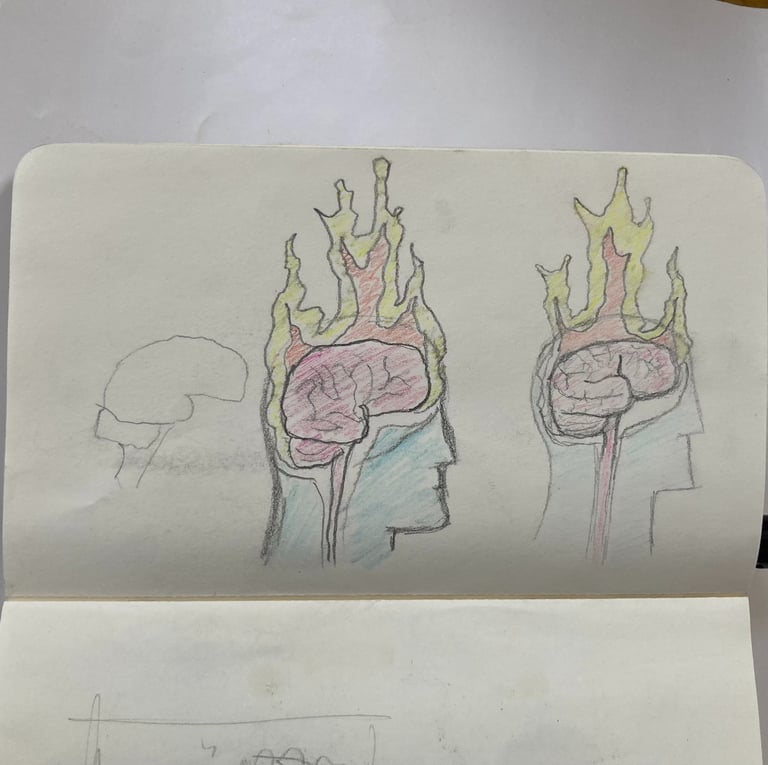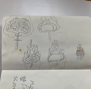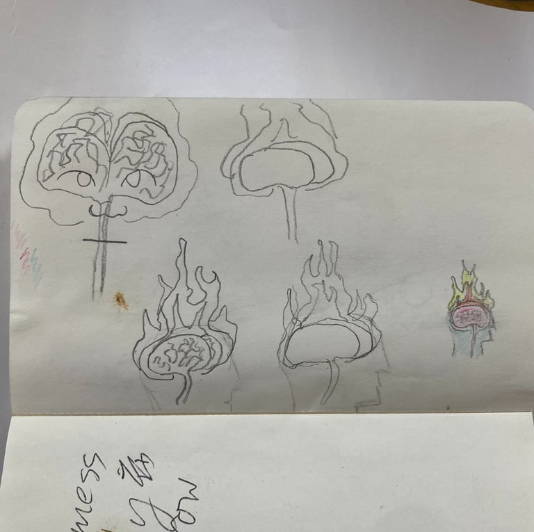 I settled on a cool blue for the head quite early on, as it drew an effective contrast with the flames. By the second round of sketches, I had loosely researched the anatomy of the human brain which I felt was important for the truthfulness and clarity of my depiction. I decided that the head should have simplified features, so that it wouldn't take attention away from the focus of the piece, and also it would make it more universal.