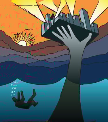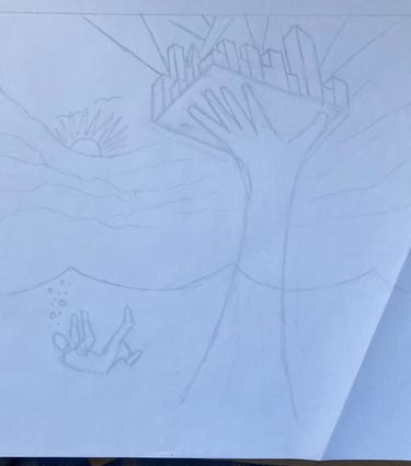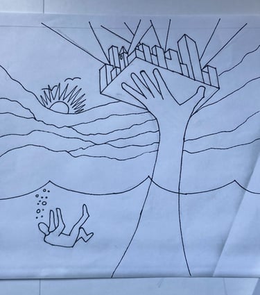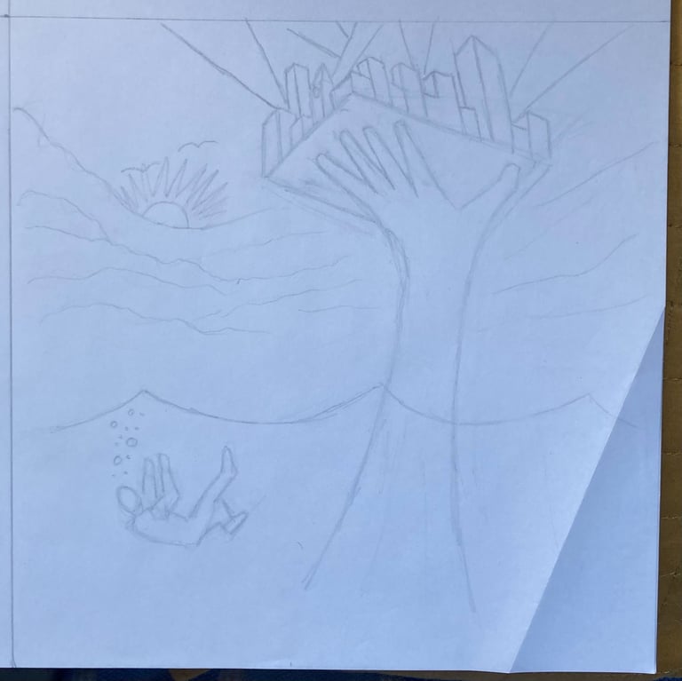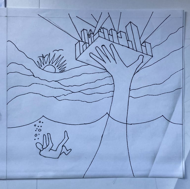 As the piece went on, I imagined the colossal hand of those in power, the "merchants of paradise" holding their utopia aloft, with its shining lights and impressive skyscrapers where "[they] sell what [they] will". Behind some biblical storm clouds, the sunset is just visible, watching, as above it rise two birds as symbols of a distant "free[dom]".