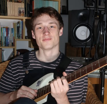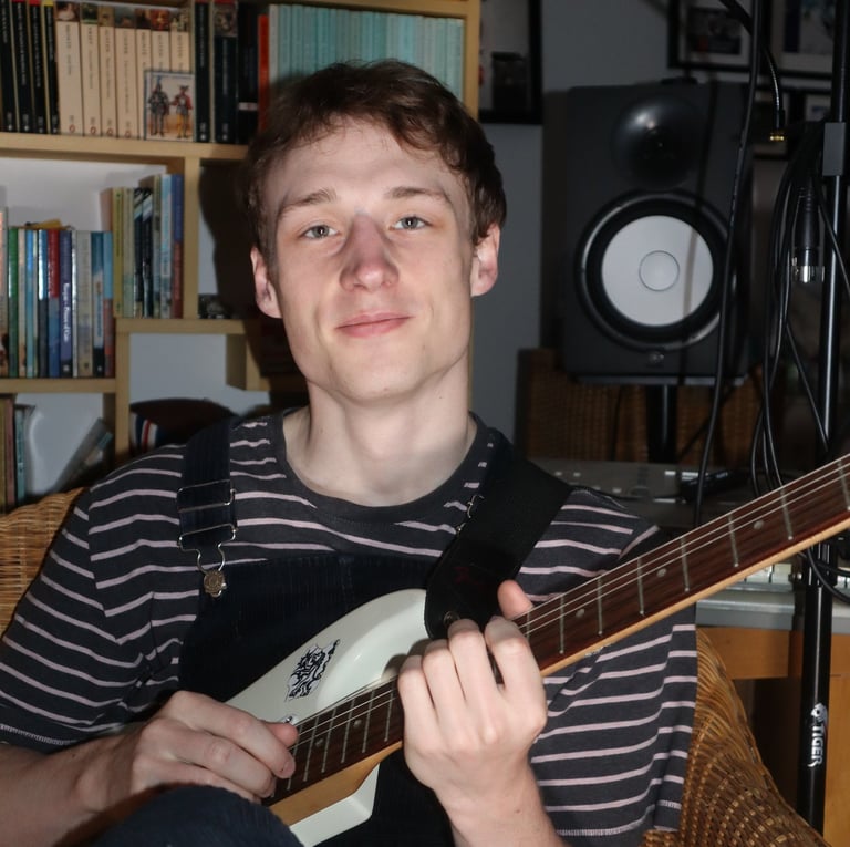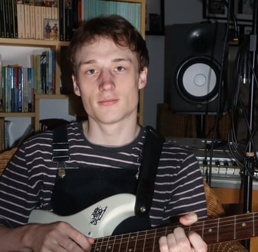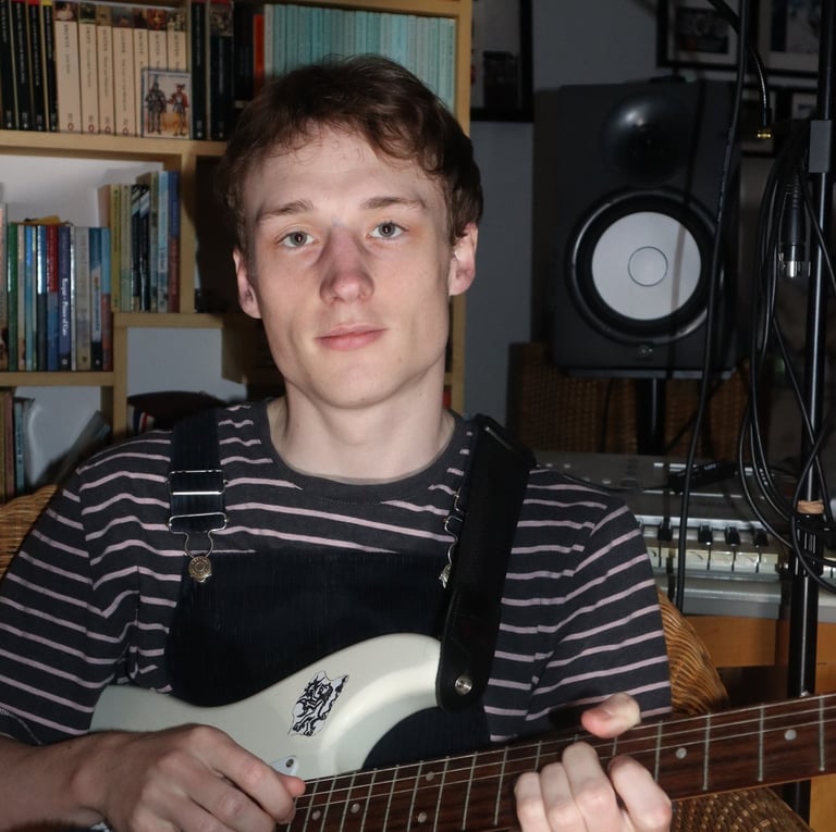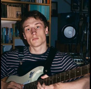 I posed with my guitar, showing the sticker I made of a symbol that holds a lot of personal meaning, which added to this statement of artist identity. I tried a few poses before settling on the one that I thought fit best. For styling, I chose dungarees and a striped t-shirt for two reasons, firstly that it fit with the aesthetic of the project and secondly, it was a nod to my inner-child whose curiosity helped shape the record.